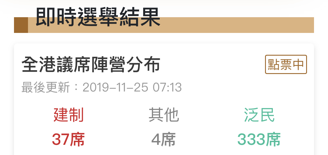 【07:16】点票还未结束,截止目前,建制派大幅落后。