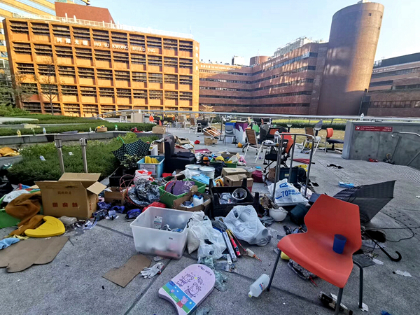 這兩天在校園裏,基本上只見到「一胖一瘦」兩位留守者公開走動。他們昨午出來見記者的時候,聲稱還有數十位同伴留守,身體和健康情況都不是特別好,更指部分人情緒極受困擾,開始精神錯亂,無法正常溝通,有人講不到一句完整說話。惟這都未能求證。