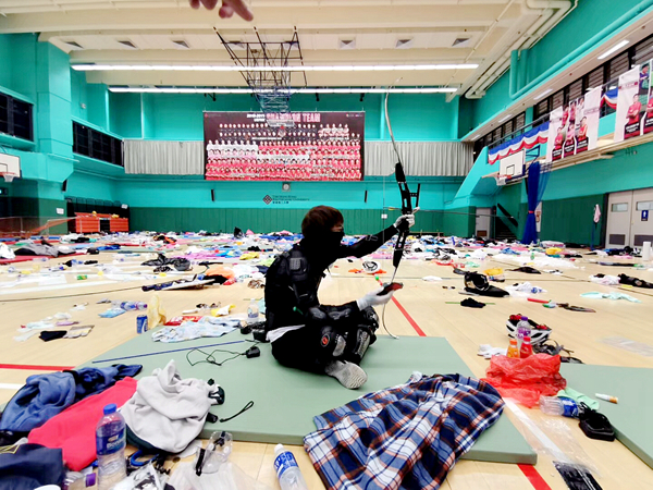 理大體育館內一名留守者手持弓箭。記者周偉立攝