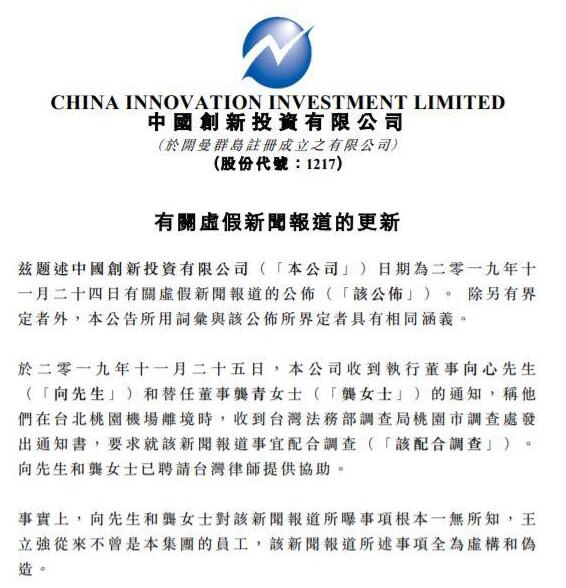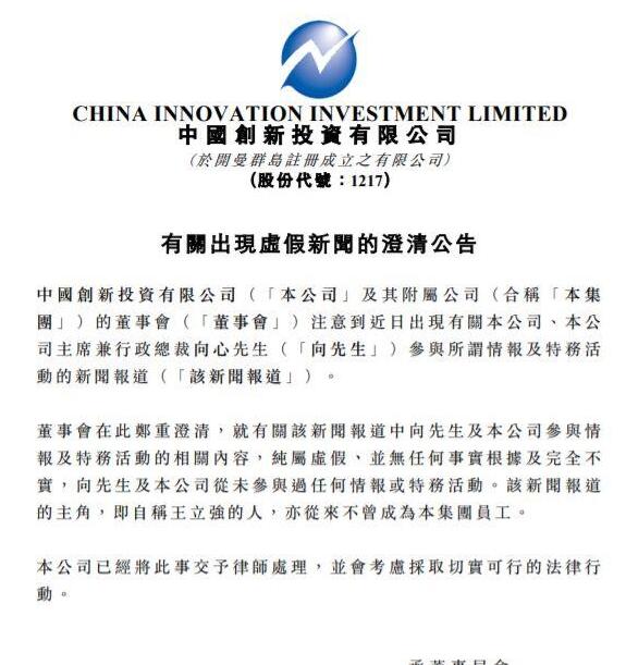 中国创新投资公司25日发表公告,证实已收到向心夫妇的通知。