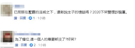 有网友讽刺称“(赖清德)已屈服在权霸的淫威之下,还敢说主子的坏话吗?2020下架双标诈骗(民进)党。”“为了权位,连一个人的尊严都没了?好笑!”