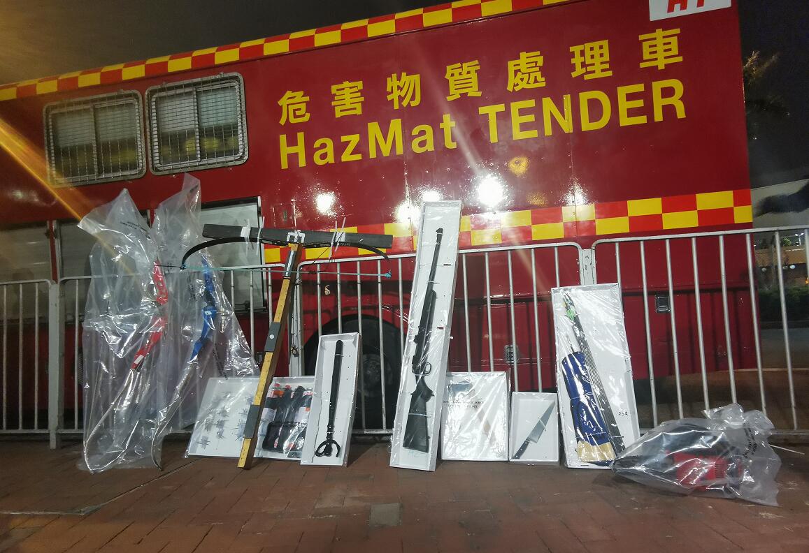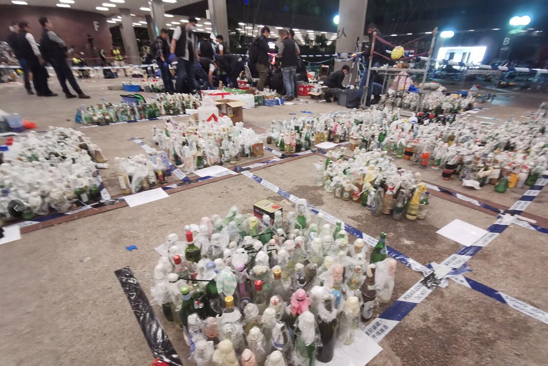 今天处理的危险品大部分都是汽油弹,以及相关的原材料,包括白电油,燃汽,有部分的燃点低至36度,需要马上处理,在学校大门进来的平台,满满一地的危险品,甚是壮观,上百位警员变身工人,蹲在一大堆汽油弹中间,清点,逐个包上保鲜膜,再装入纸箱,足足包了几个小时。现场的记者都在比较到底是中大的汽油弹多一些还是理大的多。