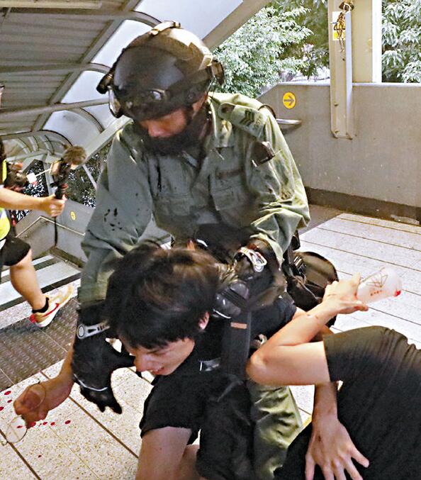 涉嫌以鎅刀割頸企圖殺警的許姓被告,當日被防暴警即場制服拘捕。 文汇报圖片