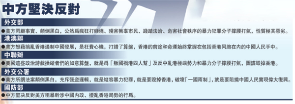 中聯辦昨發表聲明指,美國這些政治遊戲操縱者們的如意算盤,就是為「叛國禍港四人幫」及反中亂港極端勢力和暴力分子撐腰打氣,為暴力行為火上澆油,圖謀毀掉香港,其用心險惡歹毒,昭然若揭。我們要正告美方以及唯美國馬首是瞻的香港少數反對派政客,不要低估我們維護香港繁榮穩定的堅強決心,不要低估我們維護「一國兩制」的堅定意志,不要低估我們維護國家主權、安全、發展利益的能力和手段。美國當局這一系列惡劣行徑,不僅是和700多萬香港市民作對,和14億中國人民作對,也是和世界公義、國際基本準則作對。中方將採取有力措施予以堅決反制,一切後果必須由美方完全承擔!
