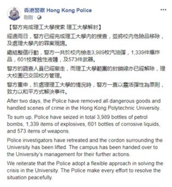 香港警方中午12时左右也在社交媒体脸书发布声明称,警方完成理工大学搜索,理工大学解封。声明表示,经过两日,警方已完成理工大学内的搜查,并将校内危险品移除。总结整个行动,警方一共与校内检走3989枚汽油弹、1339件爆炸品、601支腐蚀性液体及573件武器。警方还在声明中重申,在处理理工大学的情况时,警方一直以灵活弹性为原则,致力于以和平方式解决事件。