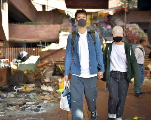 而調查人員撤走後,一對戴黑色口罩的男女中午牽手離開理大,但兩人並無透露自己是否是連日在校園內留守的示威者。