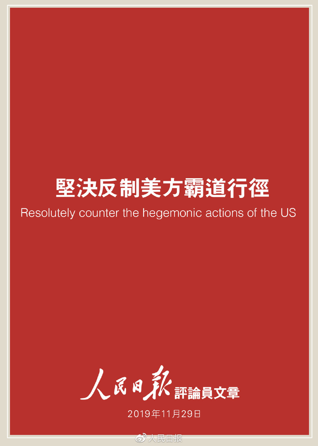 美方的霸權邏輯注定失敗,玩弄強權不會得逞。當今世界,主權平等、互不幹涉內政等國際關系基本准則深入人心。美方唯我獨尊、玩弄強權政治的霸道行徑,早已為國際社會所深惡痛絕。此次他們粗暴幹涉中國內政,企圖搞亂香港、牽制中國發展的霸道行徑,更將踢到鐵板。在涉及國家主權、安全、發展利益的原則問題上,中國絕不會屈服於任何外來壓力。美方如果仍然醉心於過時的冷戰思維和霸道作風,在香港問題上一意孤行玩弄強權,中方必將予以堅決反制。如果美方在錯誤的道路上越走越遠,中方有足夠的底氣和實力、堅定的信心和意志奉陪到底。一切後果必須由美方承擔。