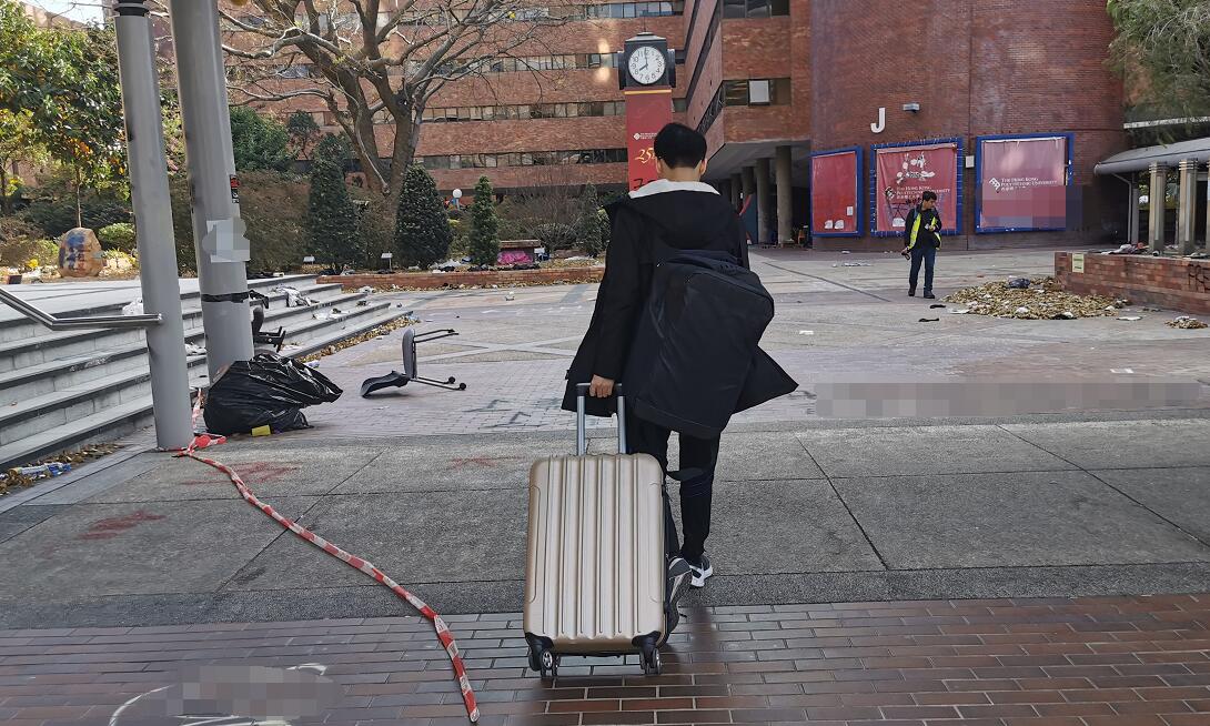 傍晚6點多,阿明背起他的大背包打算離開,校園裡的人已經很少了,夕陽打在遍地的廢墟上,暖暖中又帶點慘淡,看著他的身影漸漸消失在大門口,連最後的留守者離開了,理大事件也應該告一段落了,希望香港有一個美好的未來。(记者 木子)
