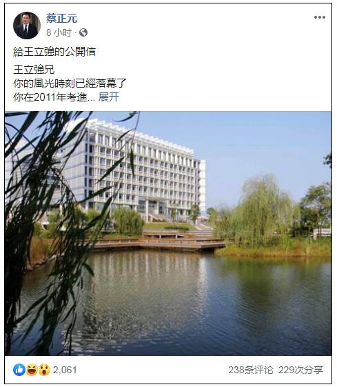 据“联合报”报道,蔡正元1日凌晨在社交媒体上发布一封“给王立强的公开信”,“起底”他在大陆的背景经历、诈骗活动及前往澳洲申请政治庇护的过程,直言对方“风光时刻已经落幕”。