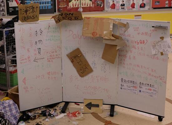 【环球网综合报道】持续近两星期的香港理工大学暴乱告一段落。11月30日,《大公报》、《文汇报》等港媒曝光了理大对峙“指挥室”:暴徒将“指挥室”设在理大食堂,并摆放“布防图”,还有物资、人手分配的展示板及所谓战绩展示。有港媒评价称,暴徒的行动高度军事化,有组织、有指挥。