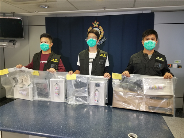 警方展示在被捕4名學生的書包檢獲噴漆、伸縮警棍及手套等。