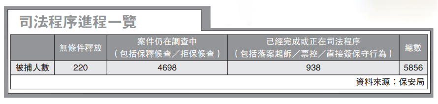 李家超表示,5889人被捕個案所涉及罪行包括「暴動」、「非法集結」、「傷人」、「襲擊致造成身體傷害」、「縱火」、「刑事毀壞」、「藏有攻擊性武器」、「襲警」、「阻礙警務人員執行職務」等,當中有3905人正保釋候查,以及有最少220人獲無條件釋放。而截至上月21日,法援署一共接獲21宗與暴亂有關的刑事案件法援申請,當中有13宗已經獲批。