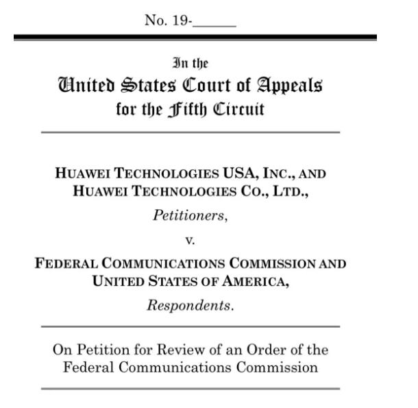 FCC于11月22日通过一项决定,将华为认定为美国国家安全威胁,并禁止美国农村地区运营商使用通用服务基金(USF)购买华为设备。在向美国联邦第五巡回上诉法院提交的起诉书中,华为认为FCC直接认定华为构成国家安全威胁,没有给予华为就相关指控进行反驳的机会,违反了正当程序原则。华为同时认为FCC并未提供任何证据或合理的理由来支撑其武断随意的决定,违反了美国宪法、《行政程序法》等美国法律。