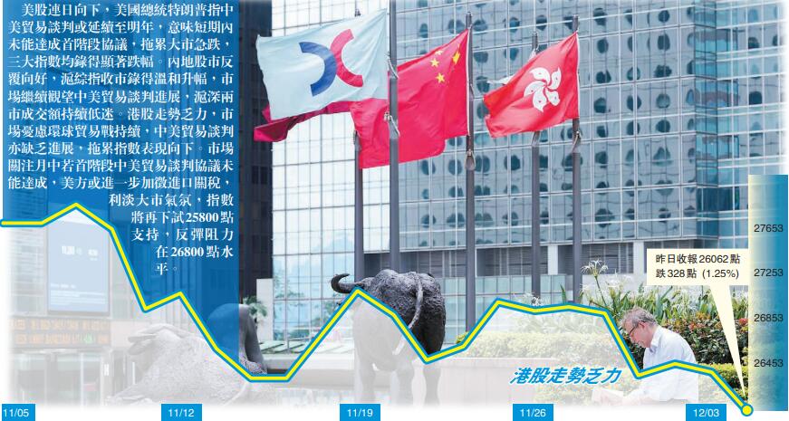 美股連日向下,美國總統特朗普指中美貿易談判或延續至明年,意味短期內未能達成首階段協議,拖累大市急跌,三大指數均錄得顯著跌幅。內地股市反覆向好,滬綜指收市錄得溫和升幅,市場繼續觀望中美貿易談判進展,滬深兩市成交額持續低迷。港股走勢乏力,市場憂慮環球貿易戰持續,中美貿易談判亦缺乏進展,拖累指數表現向下。市場關注月中若首階段中美貿易談判協議未能達成,美方或進一步加徵進口關稅,利淡大市氣氛,指數將再下試25800點支持,反彈阻力在26800點水平。
