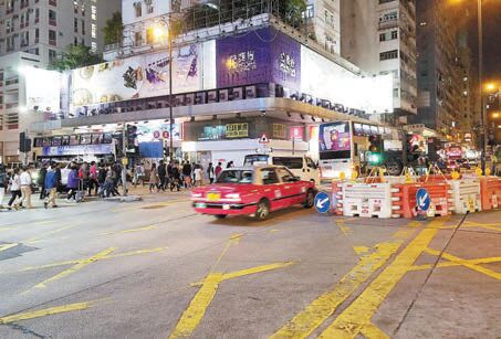 圖為彌敦道/窩打老道路口放置了臨時交通燈,並配以交通管制措施,以疏導交通和提升道路安全。