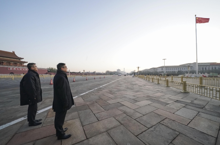 鄧炳強(右)觀看天安門廣場升國旗儀式。新華社