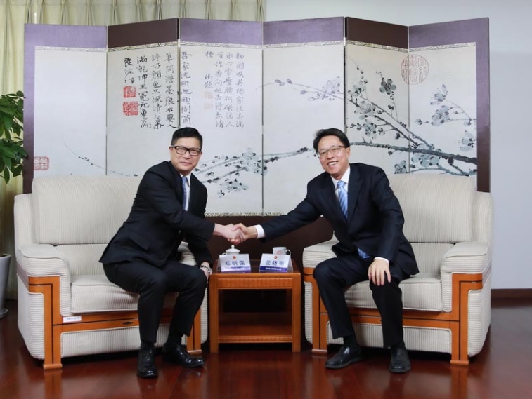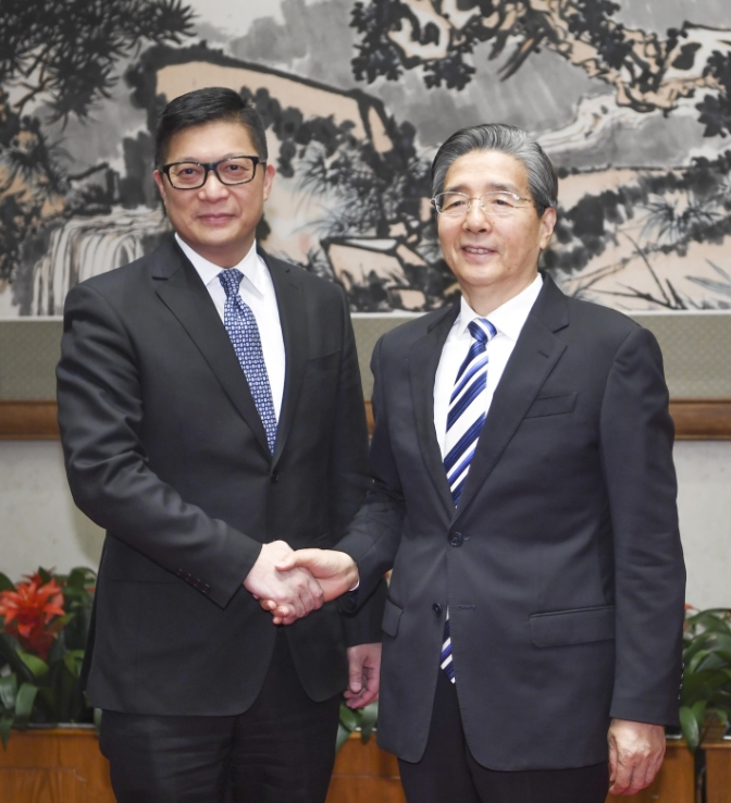 港澳辦主任張曉明(右)會見警務處處長鄧炳強。港澳辦網站