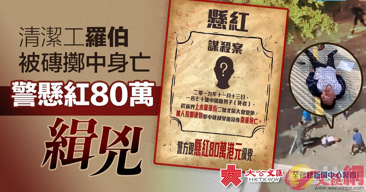 【香港商報网訊】11月13日中午,一名70歲食環署外判清潔工在北區大會堂疑遭黑衣人擲出的磚頭擊中,頭部重創,搶救至翌日不治。警方昨日在Facebook公布,已就事件懸紅80萬元緝兇。
