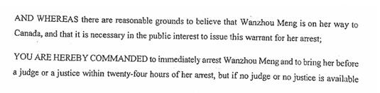 加拿大法院11月30日签发的逮捕令文件,明确指出要“立即逮捕孟晚舟”。图自加拿大不列颠哥伦比亚省法院文件截图