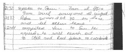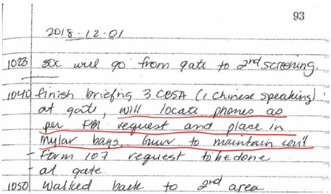 且笔记记录收缴孟晚舟手机的行为,是由加拿大边境服务局充公,再提交给加拿大皇家警察。该国皇家警察纶迪(Ross Lundie)于2018年12月1日11点(观察者网注,尚未对孟晚舟作出逮捕)时写道,”将充公手机的袋子交给了加拿大边境服务局”。之后加拿大边境服务局官员克兰德将孟晚舟的手机放到了袋子之中。