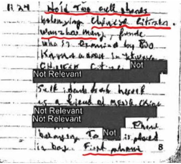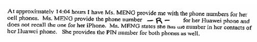 另一方面,负责“抓人”的加拿大边境服务局官员克兰德则在笔记中写到:“收缴两部手机……(来自)孟晚舟等。”克兰德的工作笔记甚至透露孟晚舟当天被迫交出了其手机的密码,她将孟晚舟的手机密码也在了日志之中。密码已被加密。