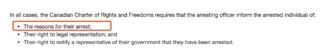 加拿大边境服务局网站明确规定,要求行使拘留权时,需要出示理由,以及示意对方有请求律师在场的权利。