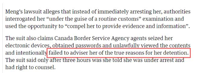 需要注意的是,加拿大皇家骑警以及边境服务局在这3小时内对孟晚舟进行的“搜查”行动,其实都是不符合法律程序的。根据加拿大边境服务局官网资料,该机构若要就对象展开拘留行为,必须提供解释。此外,该机构必须允许被拘捕对象使用手机请求法律援助。