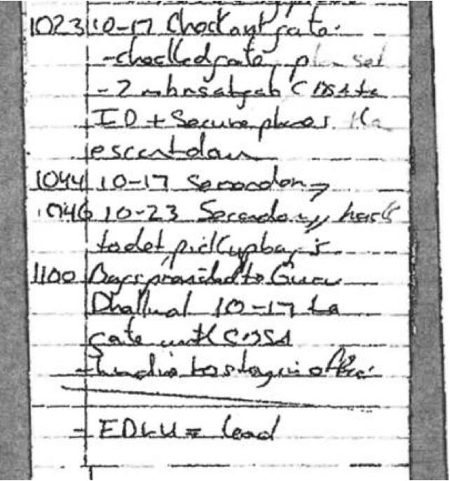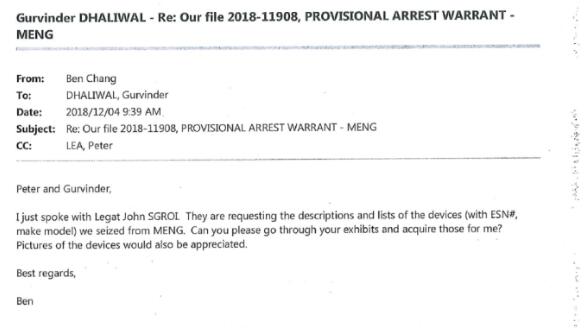 逮捕孟晚舟第四天(2018年12月4日),加拿大皇家骑警皮特·里亚(Peter Lea)工作笔记证实,他在当天早上7点许与美国FBI探员斯克里(John Sgroi)进行了通话。电话中FBI要求加拿大警方提供被扣押人的手机信息。除此以外,当天早上9点39分,加拿大皇家骑警本(Ben Chang)也给他同事达里瓦尔(Peter Dhaliwal)发送邮件,称其已与美国FBI探员斯克里(John Sgroi)通话,对方提出了相同的要求。本的这封邮件还抄送给了他的同事里亚。