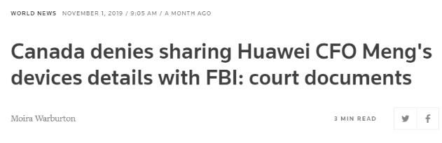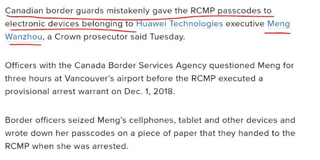 彼时,加拿大执法部门在逮捕孟晚舟过程中,不仅违背本国法院命令,故意延后3个小时拘捕孟晚舟。3个小时内,加拿大执法部门非法逼迫孟晚舟交出手机信息,将其分享给美国联邦调查局(FBI)。