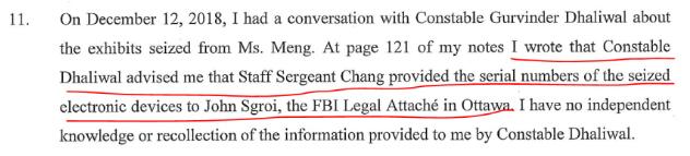 12月12日下午1点20分,孟晚舟被捕11天后,加拿大皇家骑警格拉夫在其执法笔记中明确写道,已将孟晚舟电子设备序列号提交给了美方。至此,加拿大执法部门完成向美方提交孟晚舟电子设备的递交工作——而这点也与加拿大检方所谓“未与美方共享”的说辞相矛盾。