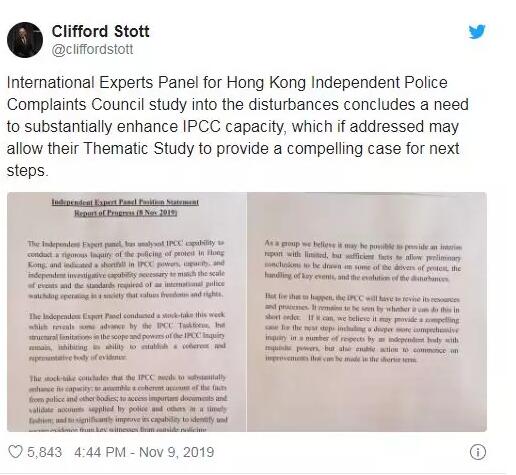 国际专家组的一名专家斯托得(Clifford Stott)在社交媒体推特(Twitter)上发布了专家小组调查声明,指出监警会缺欠调查能力,机构面临结构性限制,必须加强权力范畴,包括向警方及其他组织索取事实,迅速获取警方重要文件,不足以应付香港示威事件的规模。