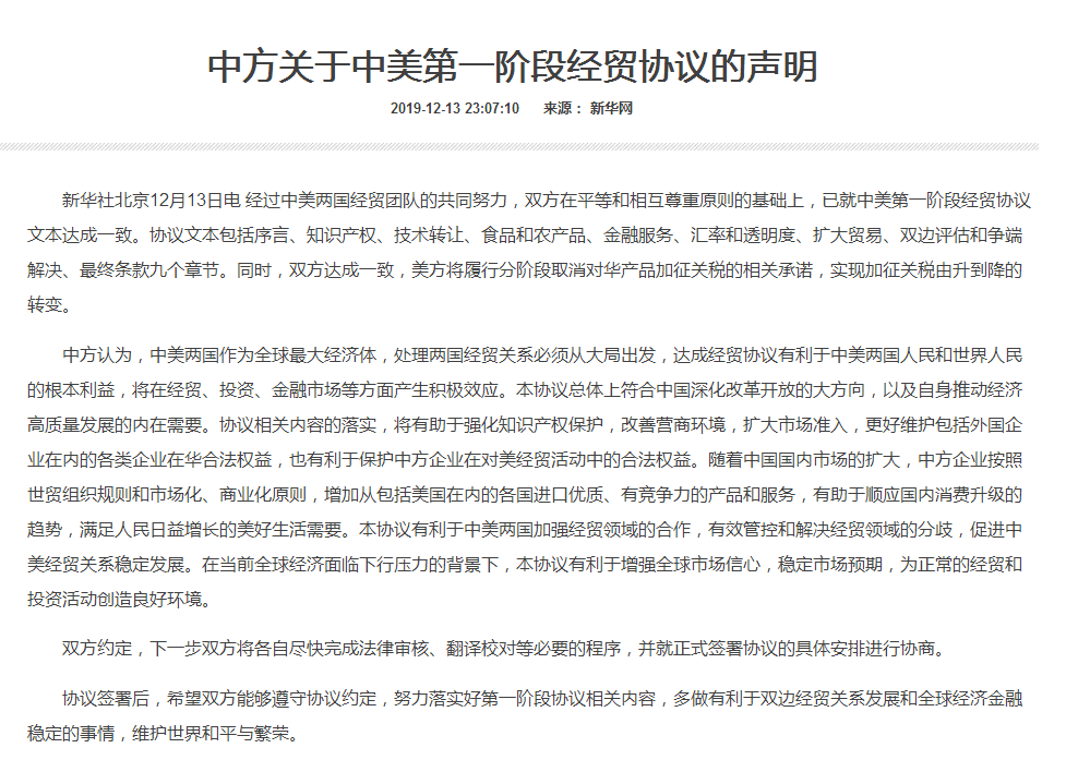 王受文宣讀中方關於中美第一階段經貿協議聲明時表示, 经过中美两国经贸团队的共同努力,双方在平等和相互尊重原则的基础上,已就中美第一阶段经贸协议文本达成一致。协议文本包括序言、知识产权、技术转让、食品和农产品、金融服务、汇率和透明度、扩大贸易、双边评估和争端解决、最终条款九个章节。同时,双方达成一致,美方将履行分阶段取消对华产品加征关税的相关承诺,实现加征关税由升到降的转变。
