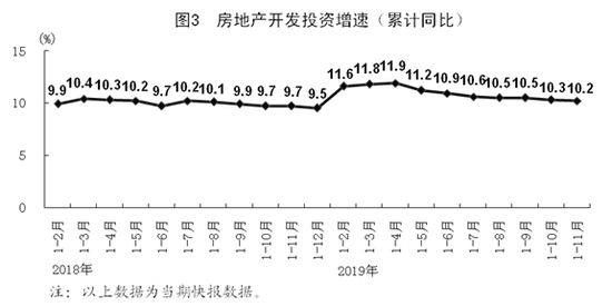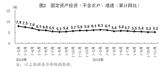 1-11月份,全国固定资产投资(不含农户)533718亿元,同比增长5.2%,增速与1-10月份持平。分领域看,基础设施投资同比增长4.0%,制造业投资增长2.5%,房地产开发投资增长10.2%。全国商品房销售面积148905万平方米,同比增长0.2%;商品房销售额139006亿元,增长7.3%。分产业看,第一产业投资下降0.1%,第二产业投资增长2.4%,第三产业投资增长6.7%。民间投资303786亿元,增长4.5%。1-11月份,高技术产业投资同比增长14.1%,快于全部投资8.9个百分点,其中高技术制造业和高技术服务业投资同比分别增长14.8%和13.1%。社会领域投资同比增长12.6%,快于全部投资7.4个百分点,其中教育,文化、体育和娱乐业投资分别增长17.5%和13.4%。生态保护和环境治理业、环境监测及治理服务投资同比分别增长36.3%、30.6%,分别快于全部投资31.1、25.4个百分点。