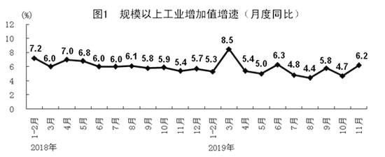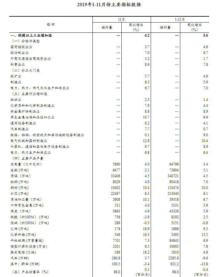 11月份,全国规模以上工业增加值同比增长6.2%,增速比上月加快1.5个百分点。1-11月份,全国规模以上工业增加值增长5.6%,增速与1-10月份持平。分经济类型看,11月份,国有控股企业增加值增长3.7%;股份制企业增长7.0%,外商及港澳台商投资企业增长3.2%;私营企业增长8.9%,增速比上月加快3.5个百分点。分三大门类看,采矿业增加值增长5.7%,制造业增长6.3%,电力、热力、燃气及水生产和供应业增长6.7%。高技术制造业、装备制造业增加值分别增长8.9%、8.5%,分别比规模以上工业快2.7、2.3个百分点;其中医疗仪器设备及仪器仪表制造业、电子及通信设备制造业分别增长12.6%和10.8%,分别比规模以上工业快6.4和4.6个百分点。太阳能(3.480, 0.03, 0.87%)电池和集成电路产量分别增长23.0%和18.2%。汽车产量增长3.7%。制造业采购经理指数(PMI)分项指数中,生产指数、新订单指数和供应商配送时间指数分别为52.6%、51.3%和50.5%,均高于临界点且均比上月有所回升。制造业生产经营活动预期指数为54.9%,位于较高景气区间。