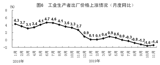 11月份,全国工业生产者出厂价格同比下降1.4%,降幅比上月收窄0.2个百分点,环比下降0.1%。工业生产者购进价格同比下降2.2%,环比下降0.1%。1-11月份,工业生产者出厂价格同比下降0.3%,工业生产者购进价格下降0.7%。