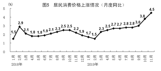 11月份,全国居民消费价格同比上涨4.5%,涨幅比上月扩大0.7个百分点;环比上涨0.4%,涨幅比上月回落0.5个百分点。分类别看,食品烟酒价格同比上涨13.9%,衣着上涨1.1%,居住上涨0.4%,生活用品及服务上涨0.4%,交通和通信下降2.8%,教育文化和娱乐上涨1.7%,医疗保健上涨2.0%,其他用品和服务上涨4.5%。在食品烟酒价格中,粮食价格上涨0.7%,猪肉上涨110.2%,鲜菜上涨3.9%,鲜果下降6.8%。扣除食品和能源价格后的核心CPI上涨1.4%。1-11月份,全国居民消费价格同比上涨2.8%。