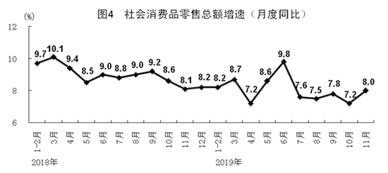 11月份,社会消费品零售总额38094亿元,同比增长8.0%,增速比上月加快0.8个百分点。其中,扣除汽车以外的社会消费品零售总额增长9.1%。1-11月份,社会消费品零售总额372872亿元,同比增长8.0%。按经营单位所在地分,11月份,城镇消费品零售额32345亿元,增长7.9%;乡村消费品零售额5748亿元,增长9.1%。按消费类型分,餐饮收入4964亿元,增长9.7%;商品零售33130亿元,增长7.8%。消费升级类商品较快增长。限额以上单位化妆品类、饮料类和通讯器材类商品分别增长16.8%、13.0%和12.1%,增速分别快于全部社会消费品零售总额8.8、5.0和4.1个百分点。