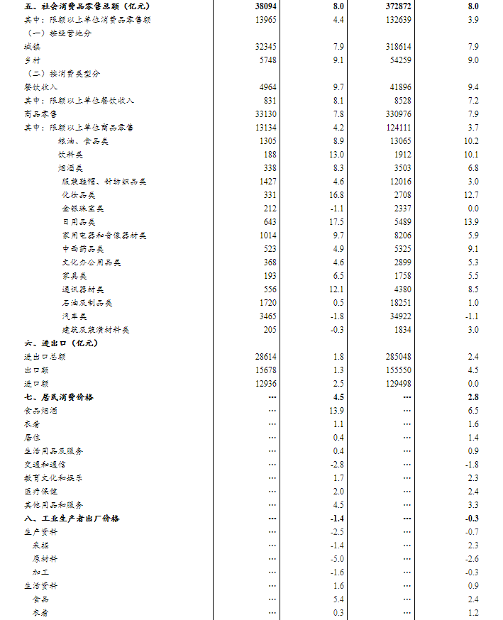 (7)城镇新增就业人口数据来源于人力资源和社会保障部;进出口数据来源于海关总署。