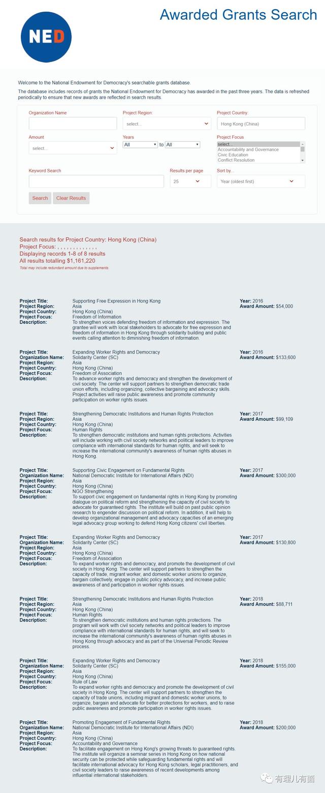 其中,NDI在香港的活动从1997年起开始活跃。2018年,NED向NDI拨款20万美元,同时单独向香港NGO组织“香港人权监察”直接拨款9万美元,用于资助它们的组织活动。保守估算,“香港人权监察”自1995年至2013年,从NED手中至少领取了190万美元活动资金。同时,NED通过NDI等分支机构,以相同的方式与“香港记者协会”、“公民党”、“工党”和“民主党”等组织保持密切联系。