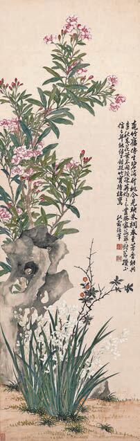 此畫畫法工整,取捨明確,筆跡有序。左下數叢幽蘭,花盛葉茂,穿插有度。枝葉舒展婀娜,神清骨秀,色澤柔和,花的周圍以青色淡淡地渲染,襯托出花朵的高雅潔淨,予人以春意盎然之感。奇石玲瓏嵌空,溶洞貫通,瘦中見奇,透中見深,頗見文人意趣。夾竹桃、奇石、石榴、幽蘭四者錯落有致,通過奇石的玲瓏竅眼,表現出多層次的前後空間感。
