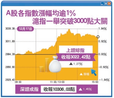 【香港商報网訊】A股三大股指昨日全線衝高,滬指成功收復3000點整數關口,創業板指創出2018年5月以來的新高。截至收盤,滬指報3022.42點,上漲1.27%;深成指報10306.03點,上漲1.45%;創業板指報1801.62點,上漲1.20%。盤面上,券商板塊領漲,銀行板塊表現強勢。