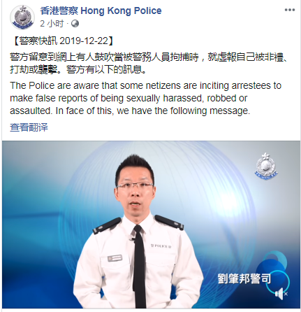 【环球网报道】香港警方今天(22日)下午在脸书发布视频,警察公共关系科警司刘肇邦在视频中针对网上有人鼓吹当被警务人员拘捕时,就虚报自己被非礼、打劫或袭击一事进行回应。