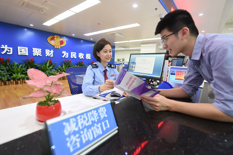 圖為福州市稅務局辦稅服務廳工作人員介紹減稅降費政策。新華社