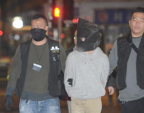 青年被捕後黑布蒙頭帶署調查。 資料圖片