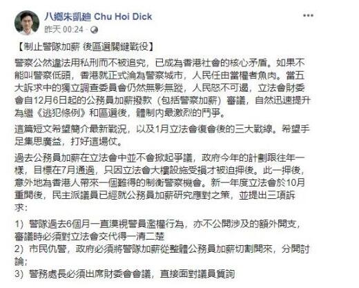 一直為此事“出力”的“港獨”議員朱凱迪24日在社交媒體上發文,再出三個“毒招”,誓要阻警加薪。