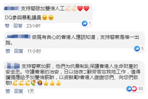 在网友的留言中,更多的是表示对港警的支持,“支持警队双倍加薪”,“作为有良心的香港人应该知道,支持警察是唯一出路。” ↓