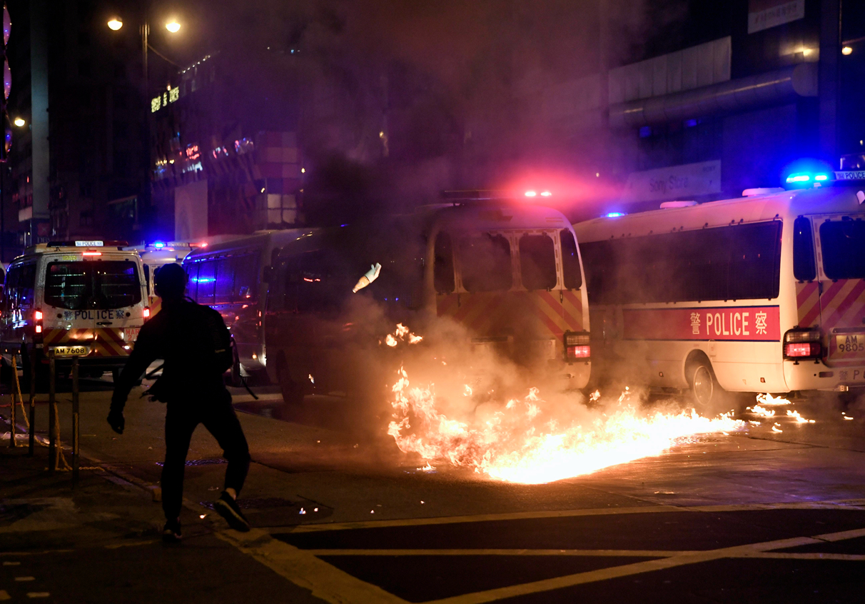 聖誕假期香港黑暴陰霾不散,有暴徒肆意打破銀行玻璃大門,更向警車投擲汽油彈,企圖製造社會恐慌。資料圖片