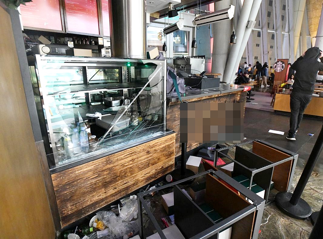 郭嘉銓說,商場以外的店舖也被騷擾,有暴徒要求一店舖交出閉路電視後被拒便發難,既打爛店舖物品,又將桌椅擲向職員,「最可悲是事後有聲明貼出,有關店舖已交出CCTV(閉路電視),要求暴徒不要再針對他人」。他稱,這是黑社會的慣常手法:「暴徒的黑色暴力令全城陷入恐慌。」暴徒於平安夜在油尖旺一帶,打爛、扯爛銀行的玻璃外牆和閘門,更用火燒毀銀行、港鐵站電箱,並在彌敦道一帶堵路、縱火,甚至向警車投擲汽油彈。