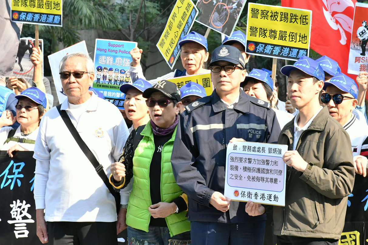 「保衛香港運動」主席傅振中表示,今次集會是希望向警務處處長鄧炳強遞交請願信,強烈要求警方積極保護國旗及警隊尊嚴,並加強警力和裝備,保護同僚之人身安全及有效預防侮辱國旗及襲警罪案發生。他說,希望警隊「一哥」謹記對暴民仁慈就是對良民殘忍。為了盡快止暴制亂,以及保護好前線警務人員,建議警隊配備電槍或電棍。