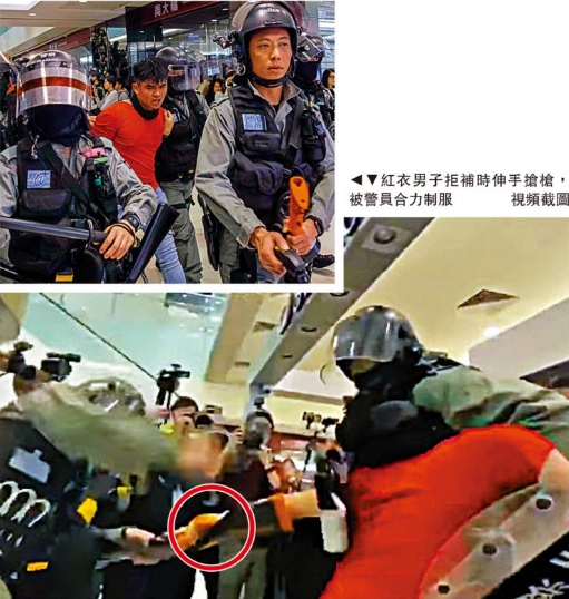 傍晚6点左右,一名香港男子因被指在现场拍照而遭人“私刑”,被暴徒打得头破血流。防暴警察及时出现解救,并进入商场追捕涉事暴徒,警方将一名红衣男子制服,期间这名红衣男子曾抢一位防暴警员的长枪。